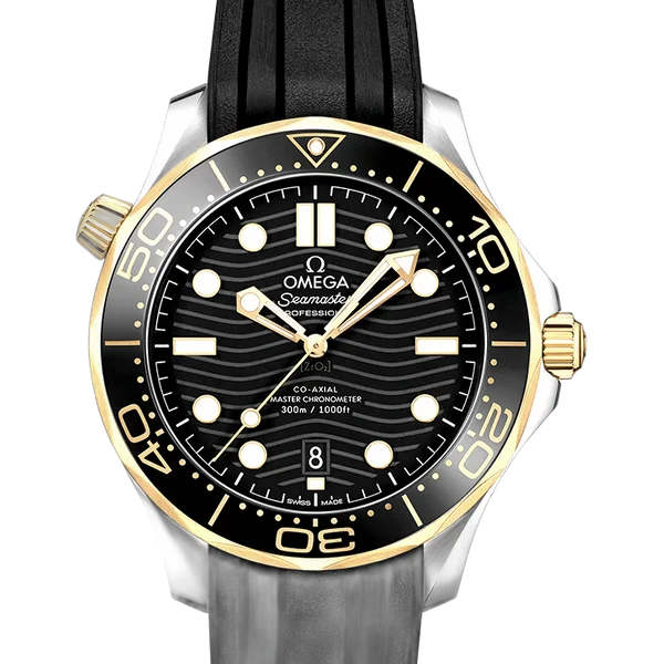 The Omega Seamaster Diver 300M Master Co-Axial 42 is a professional diver's watch combining maritime heritage with cutting-edge technology. Features include a helium escape valve and exceptional water resistance, making it suitable for the most demanding underwater missions. Presented in gold/steel with 42mm case, water-resistant to 300M. Powered by Omega's Co-Axial Master Chronometer movement, certified by METAS, ensuring superior precision, performance, and magnetic resistance up to 15,000 gauss.