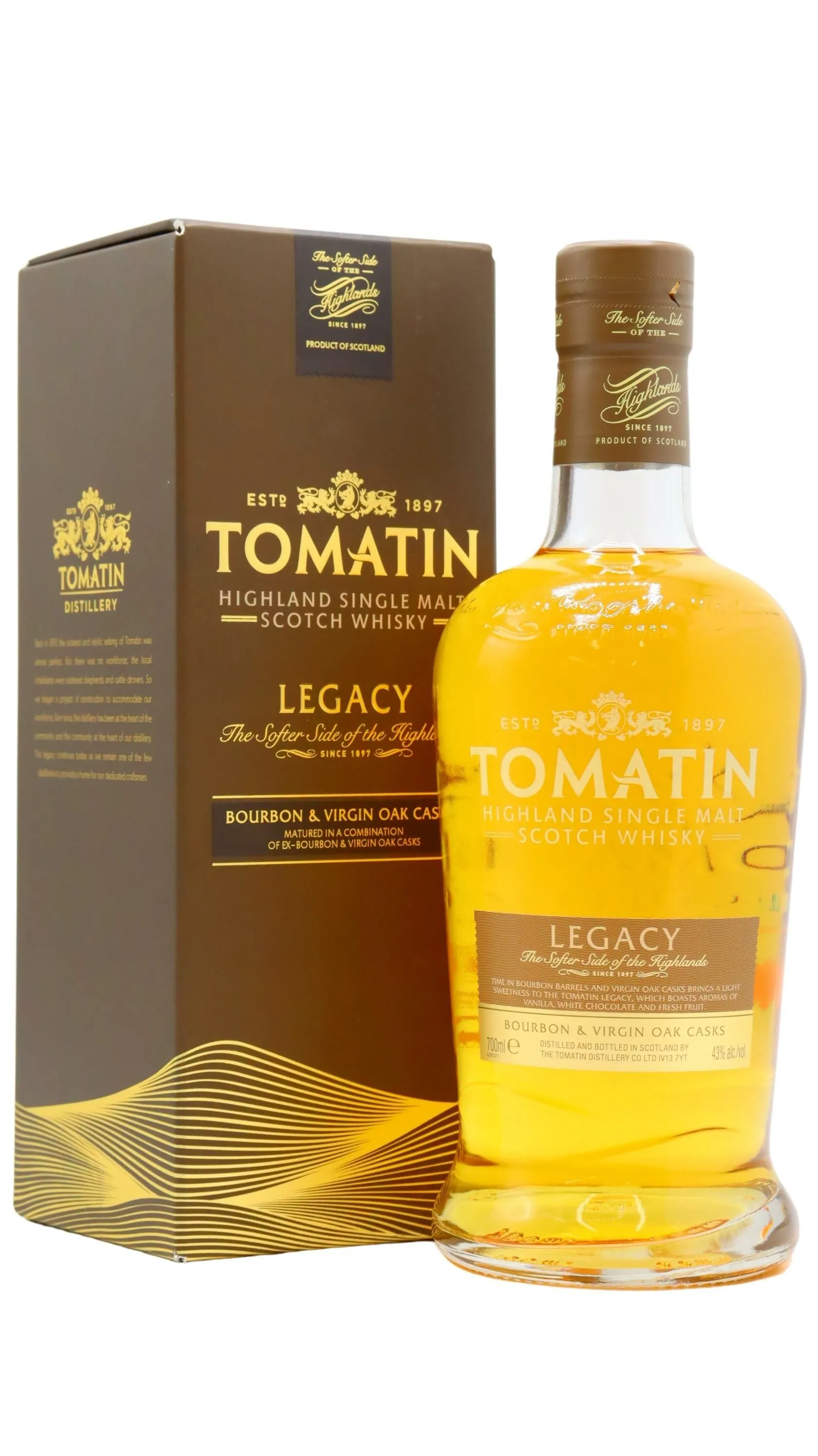 Matured in bourbon and virgin oak casks, Legacy captures Tomatin’s light Highland style.